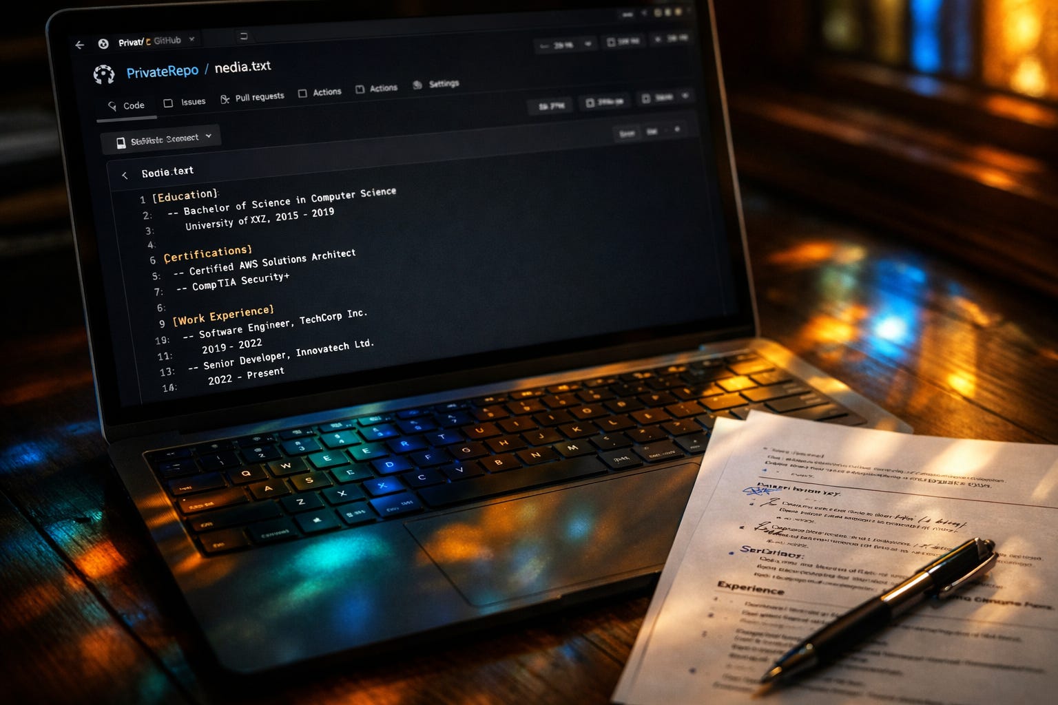 What came out of that session was nedia.txt: a structured file with my complete professional history: education, certifications, work experience, projects, context that doesn’t fit in a standard format. Everything organized so that ECHO could read it and work from it going forward.